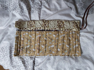 J'ai recommencé quelques mois plus tard en incluant un rabat pour ne plus perdre mes crochets. Je n'ai pas cousu jusqu'en haut la poche intérieure pour un accès plus facile aux petits crochets. J'ai centré le ruban au milieu de la trousse sans penser qu'il y avait un rabat, au final je trouve que cette façon de fermer est mieux, ça tient très bien et c'est joli 🥰 . J'y ai aussi inséré un peu de ouatine pour le confort de mes crochets 🤣🤣